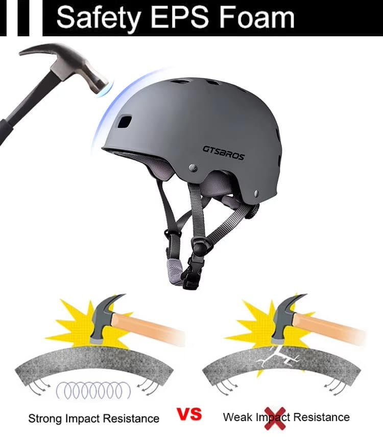 Features a high-density EPS foam core with a thickness of 0.7 inches, providing excellent impact resistance compared to standard helmets. The visual comparison clearly demonstrates its superior strength against impacts.